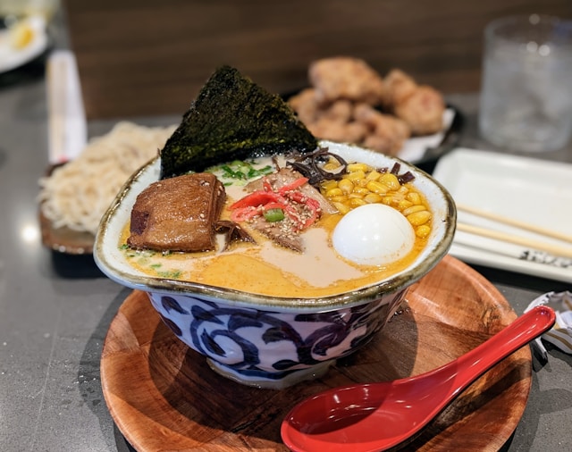 Rich, flavorful ramen bowl topped with soft-boiled quail eggs and traditional toppings.